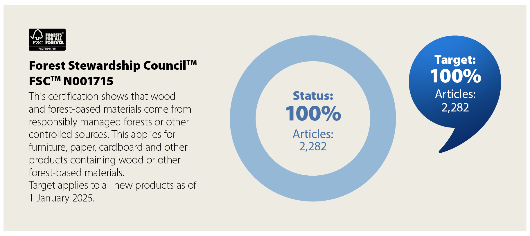 We have ambitious targets for several of our main material groups for certifications and memberships and are proud to have reached 100% for some of these in FY25.