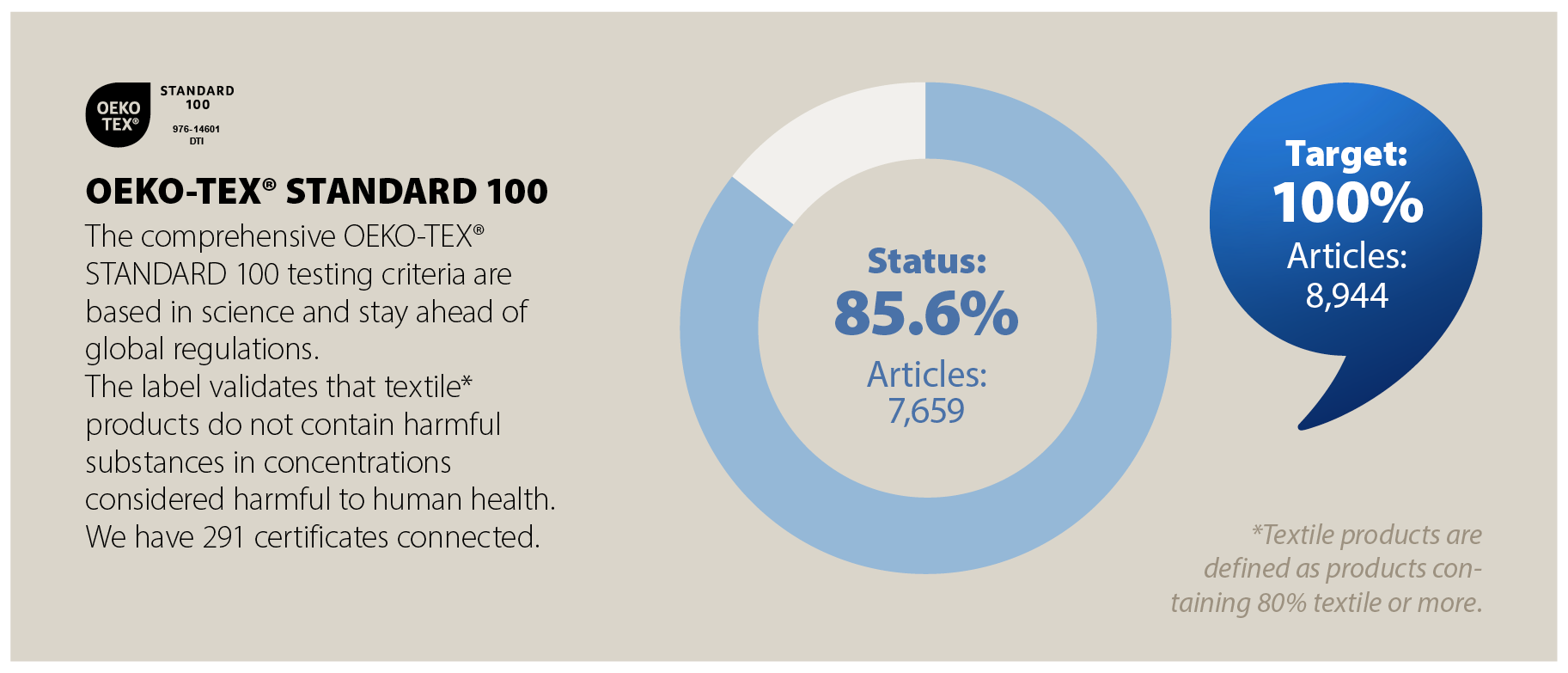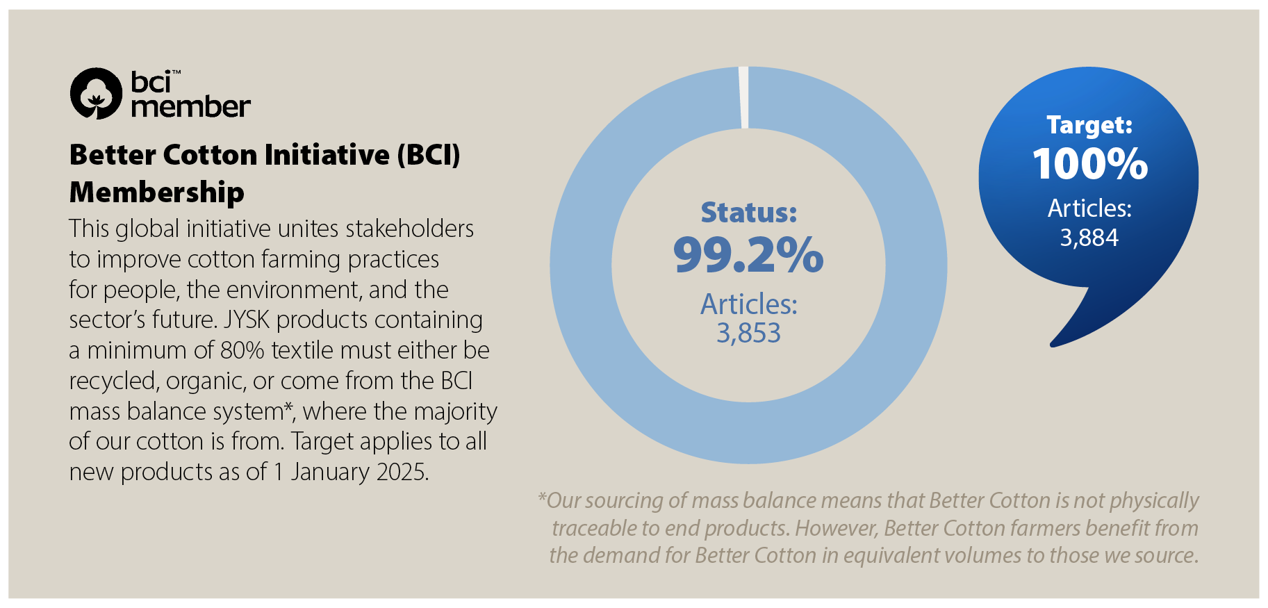 Our target is that all JYSK products containing a minimum of 80% textile must either be recycled, organic, or come from the BCI mass balance system, where the majority of our cotton is from. By the end of FY25, the amount was 99.2% of all JYSK products, and minor fluctuations will appear throughout the year.