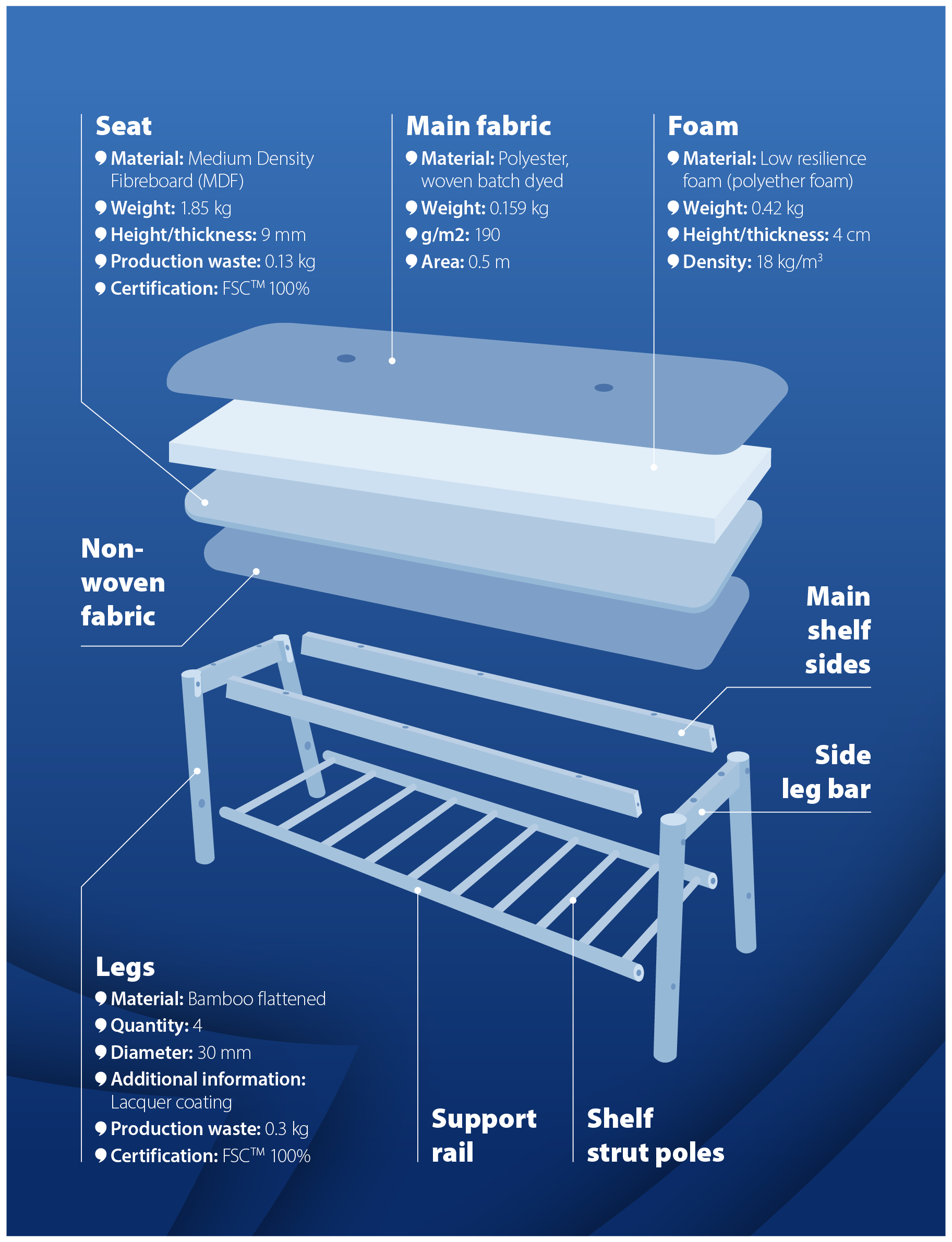The illustration shows how we will dive into product materials with an example of an exploded view of a product, where we zoom in on selected key data points.