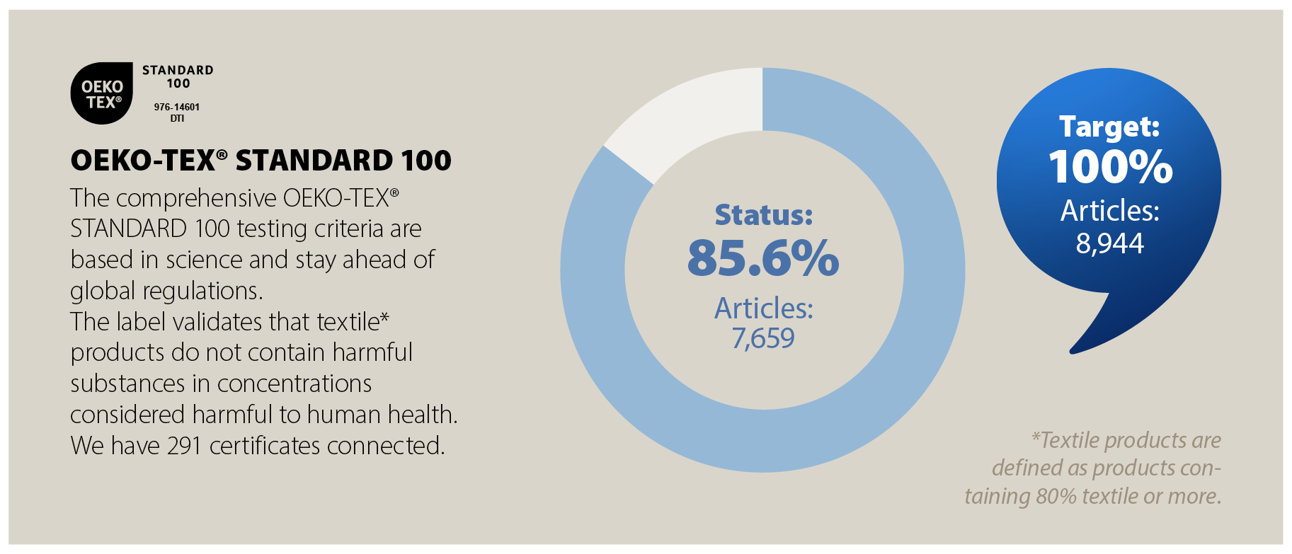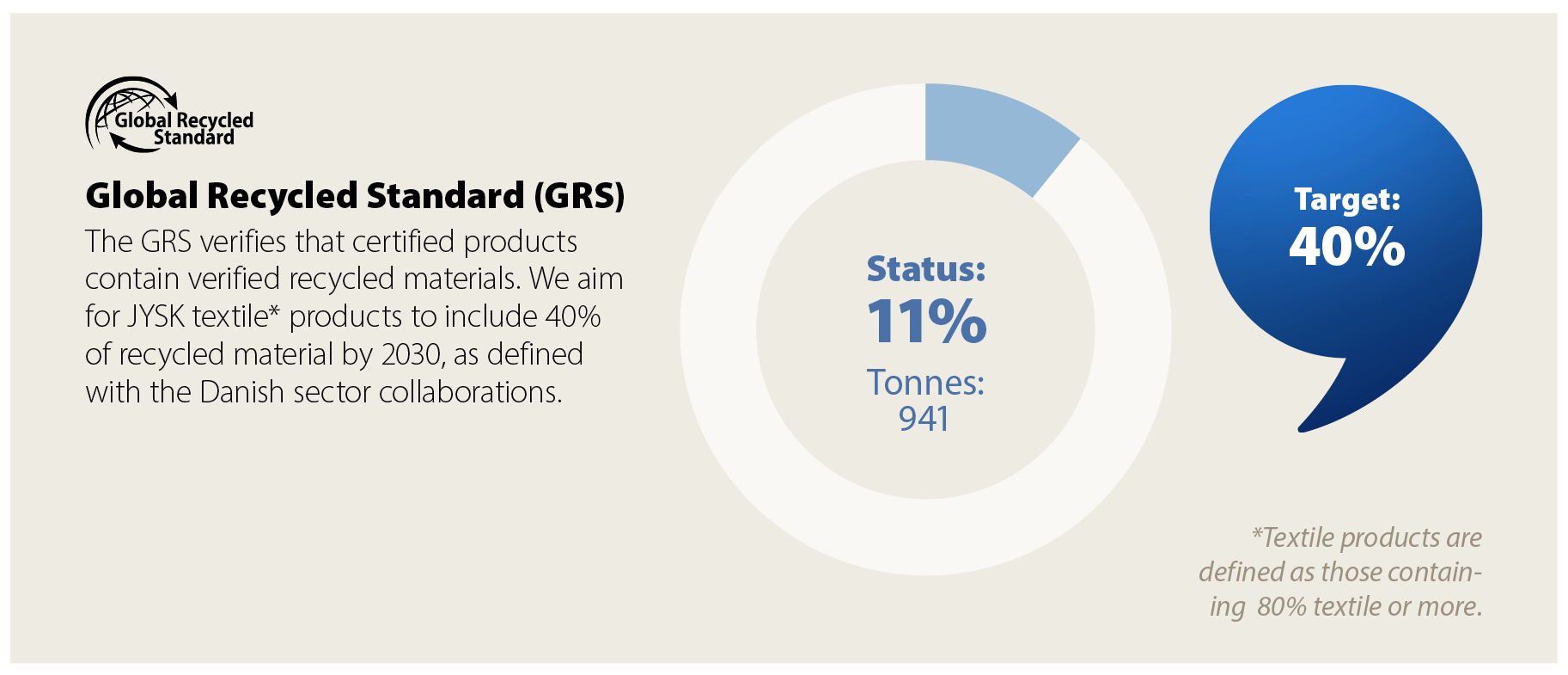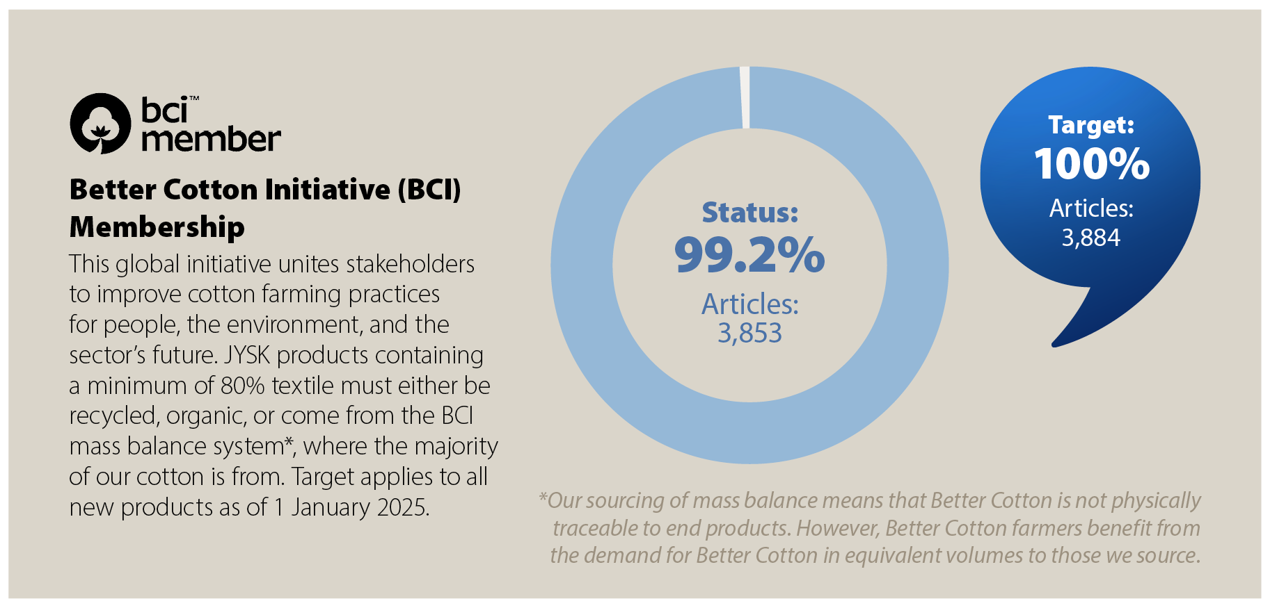 Our target is that all JYSK products containing a minimum of 80% textile must either be recycled, organic, or come from the BCI mass balance system, where the majority of our cotton is from. By the end of FY25, the amount was 99.2% of all JYSK products, and minor fluctuations will appear throughout the year.